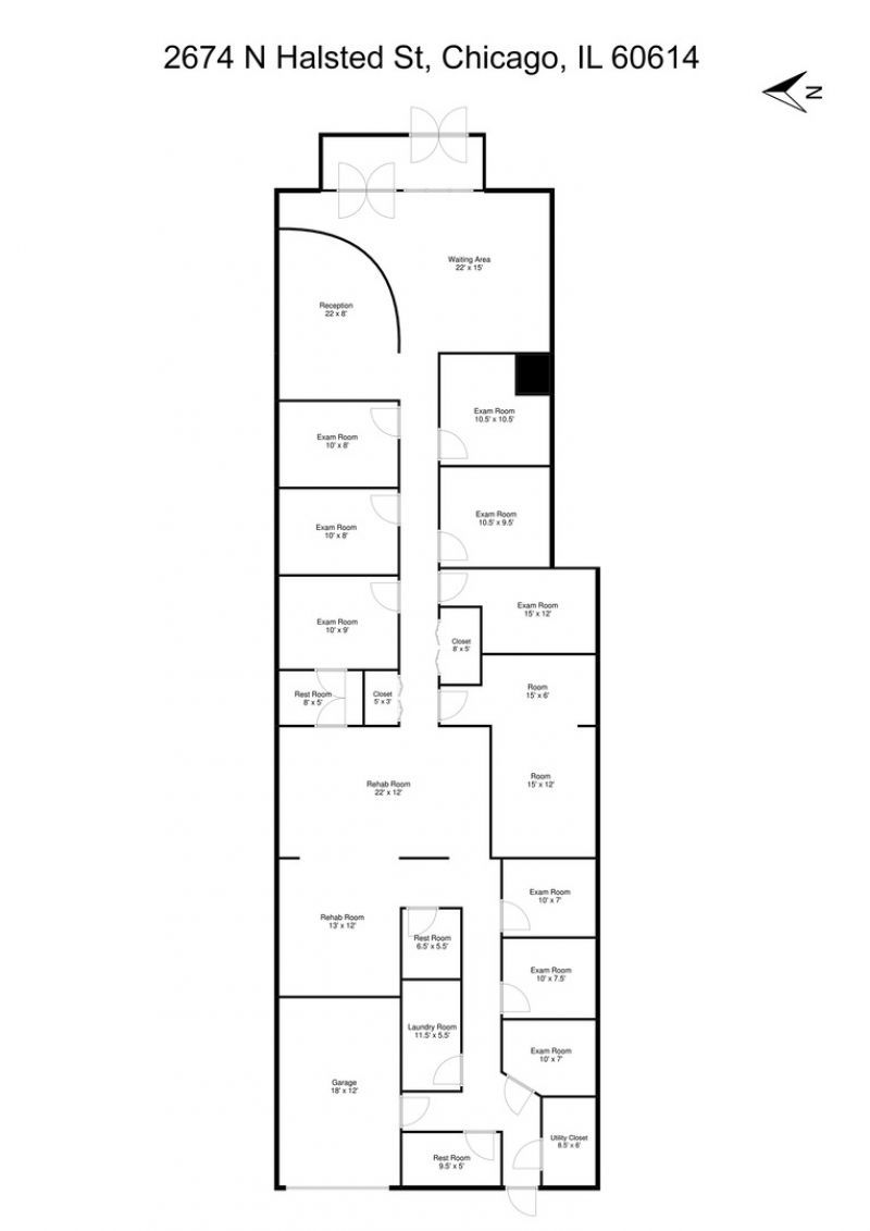 Large commercial multi-suite office space for rent in Lincoln Park. The expansive space features an elegant waiting room/ reception area with exposed brick, modern tile floors and granite counter, 8 exam rooms/ private offices, a large centrally located Rehab room, break room, storage, laundry room, and 3 restrooms- one with a shower. One garage space and 1 outdoor parking space included. Rent is $8,500/ month. Tenant is responsible for verifying square footage. Owner is licensed Illinois Real Estate Broker.